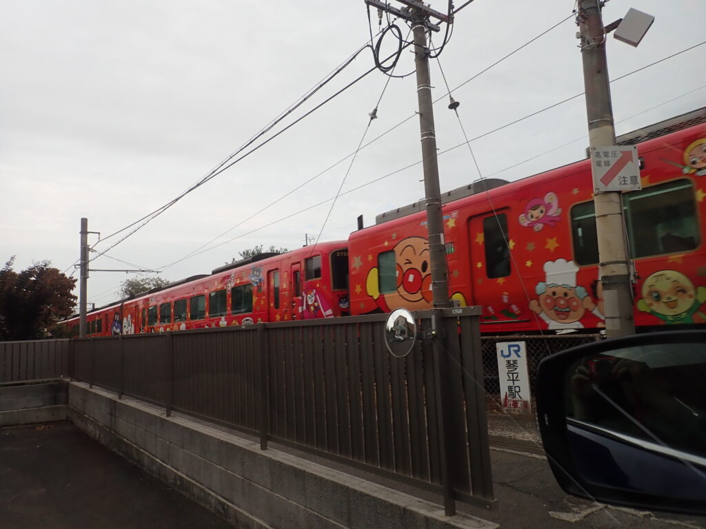 踏切待ちでアンパンマン列車に遭遇し、テンションが上がる(飼い主)。