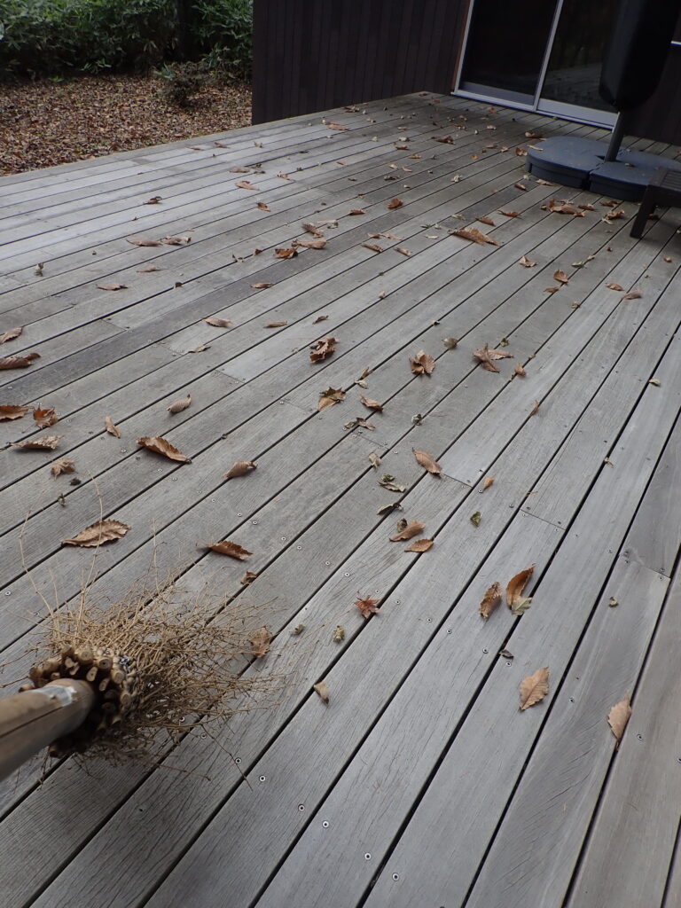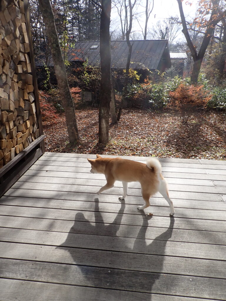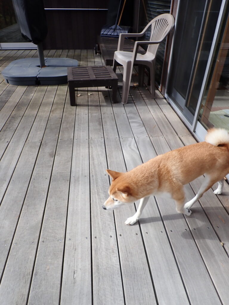 柴犬は綺麗になったウッドデッキで悠々散策。