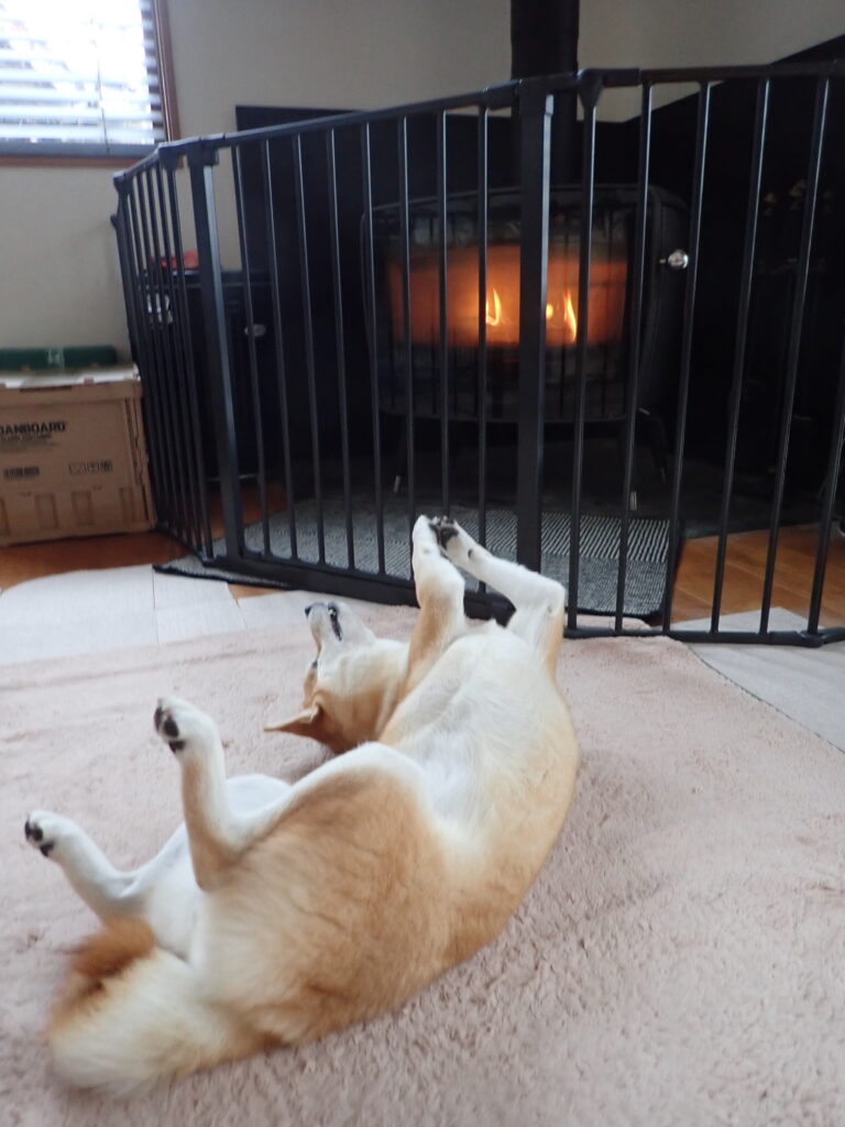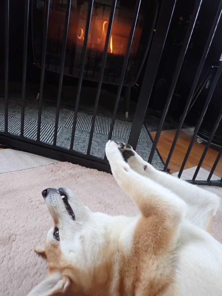 ストーブ前を陣取り、ご機嫌の柴犬。