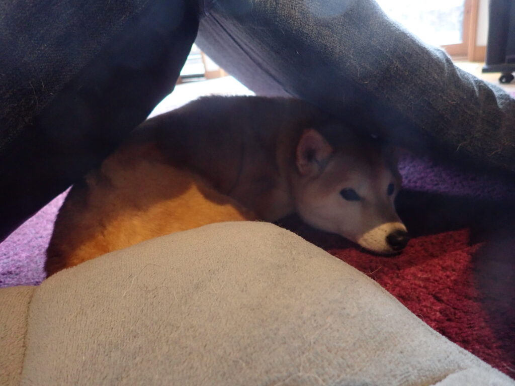 帰宅後は座椅子でバリケードを築き、暖を取る柴犬。