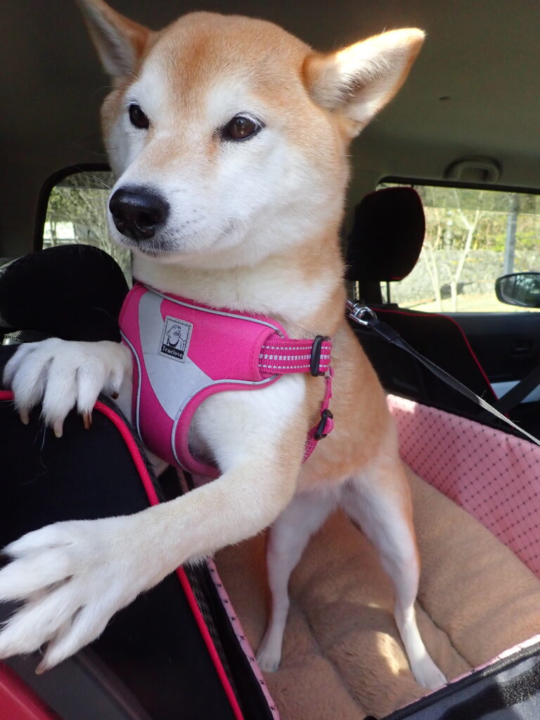 待ちきれず、車のドアを開けた途端、身を乗り出す柴犬。