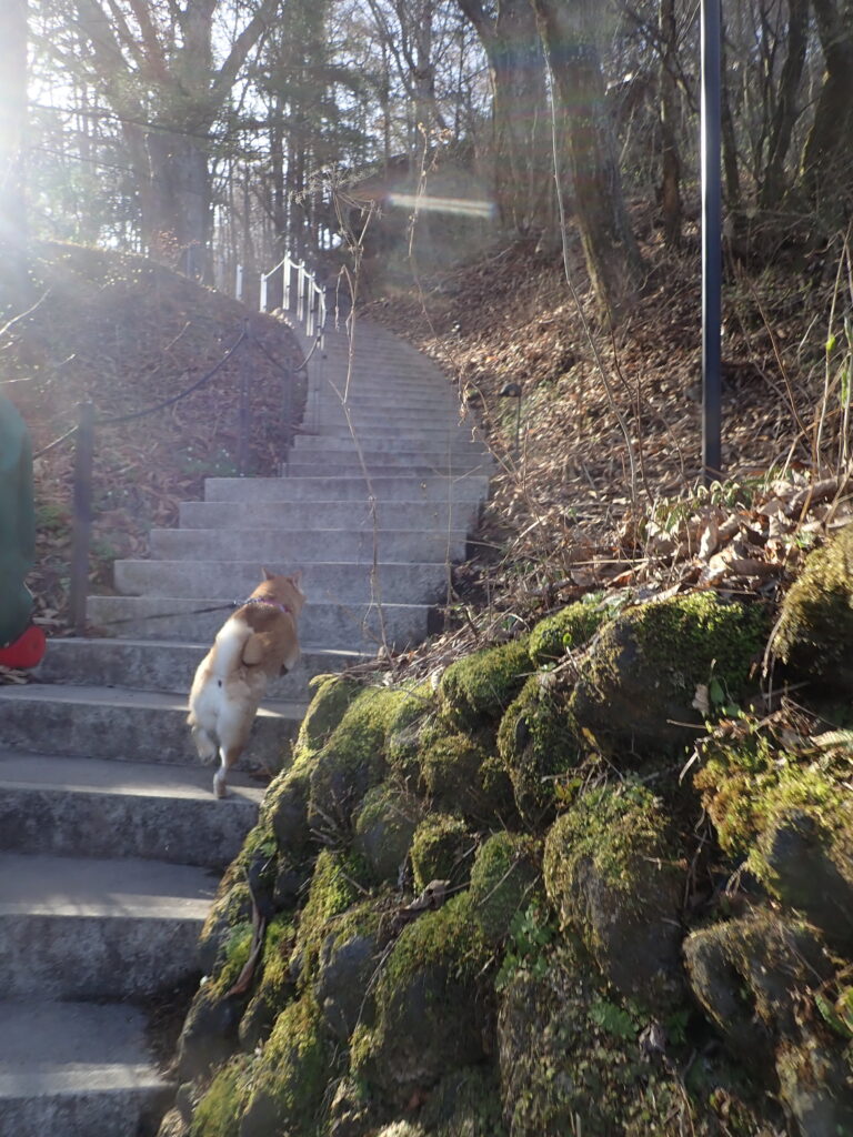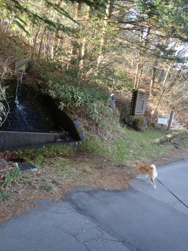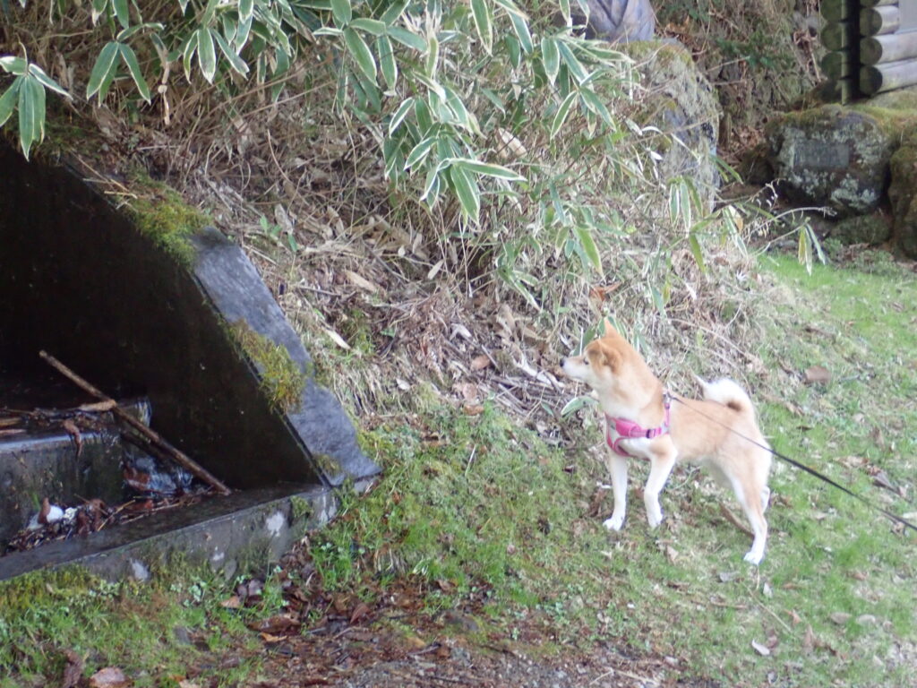 水の流れ落ちる場所が気になり、立ち止まる柴犬。