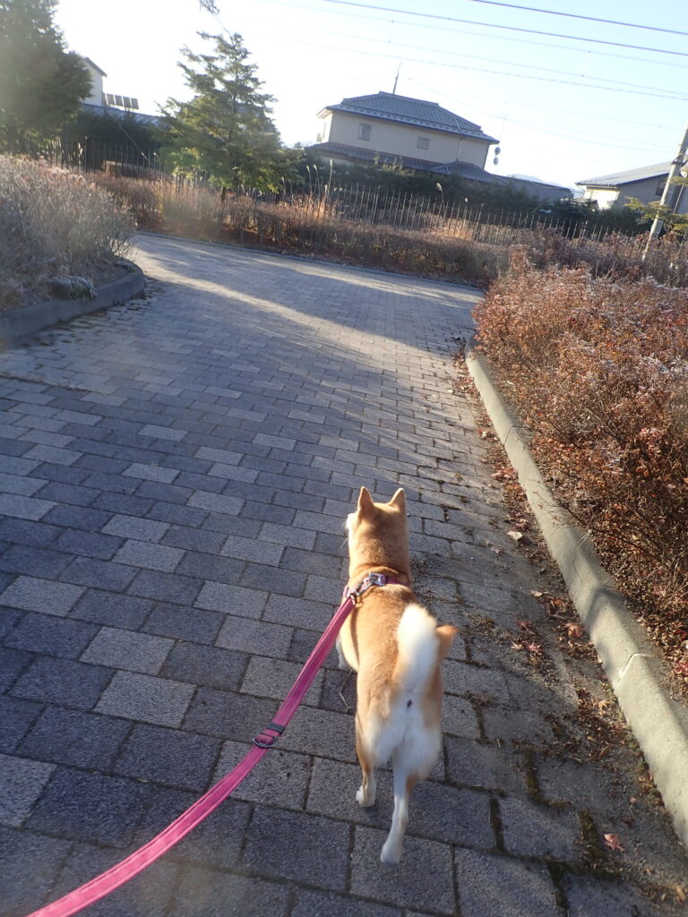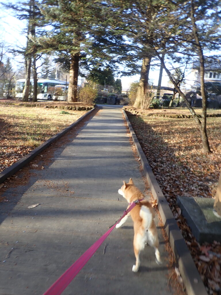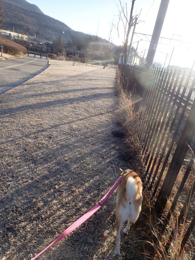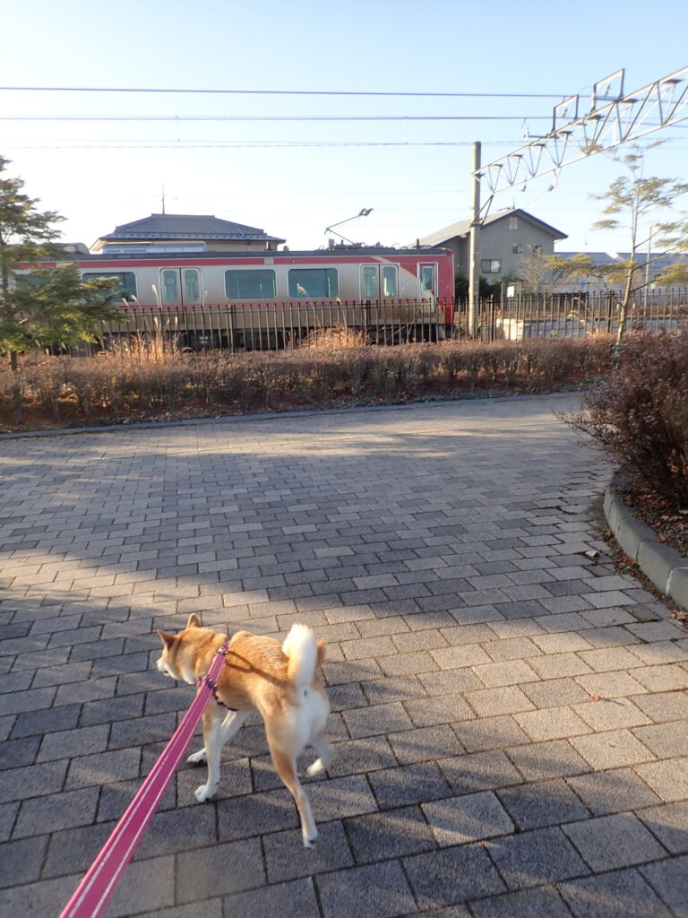 ちょうど電車に遭遇したが、柴犬は散歩優先。