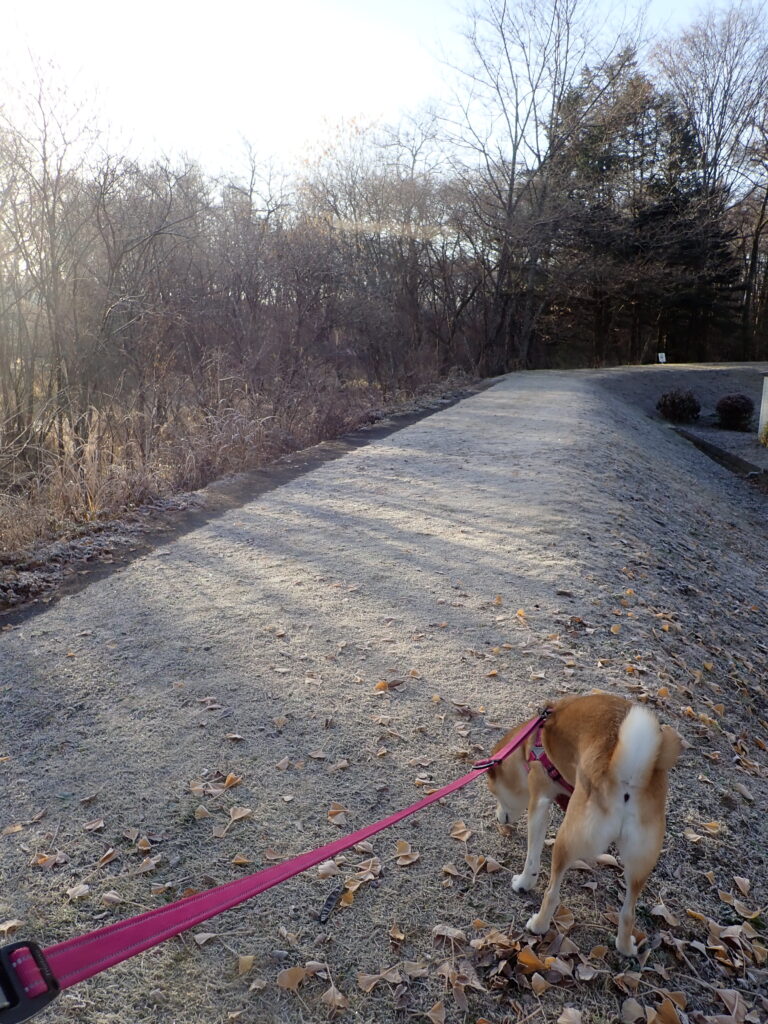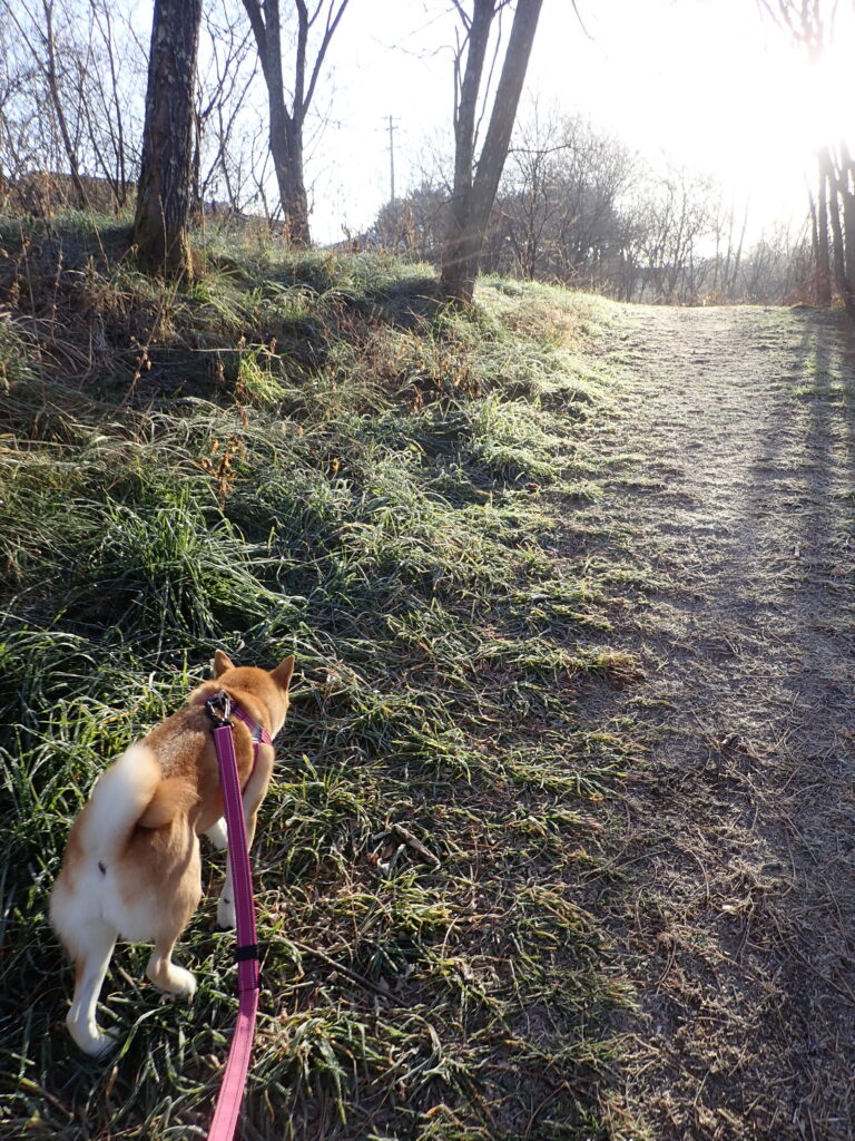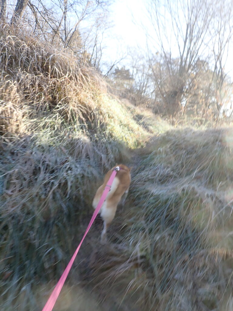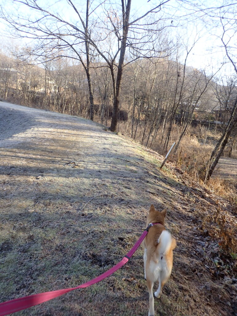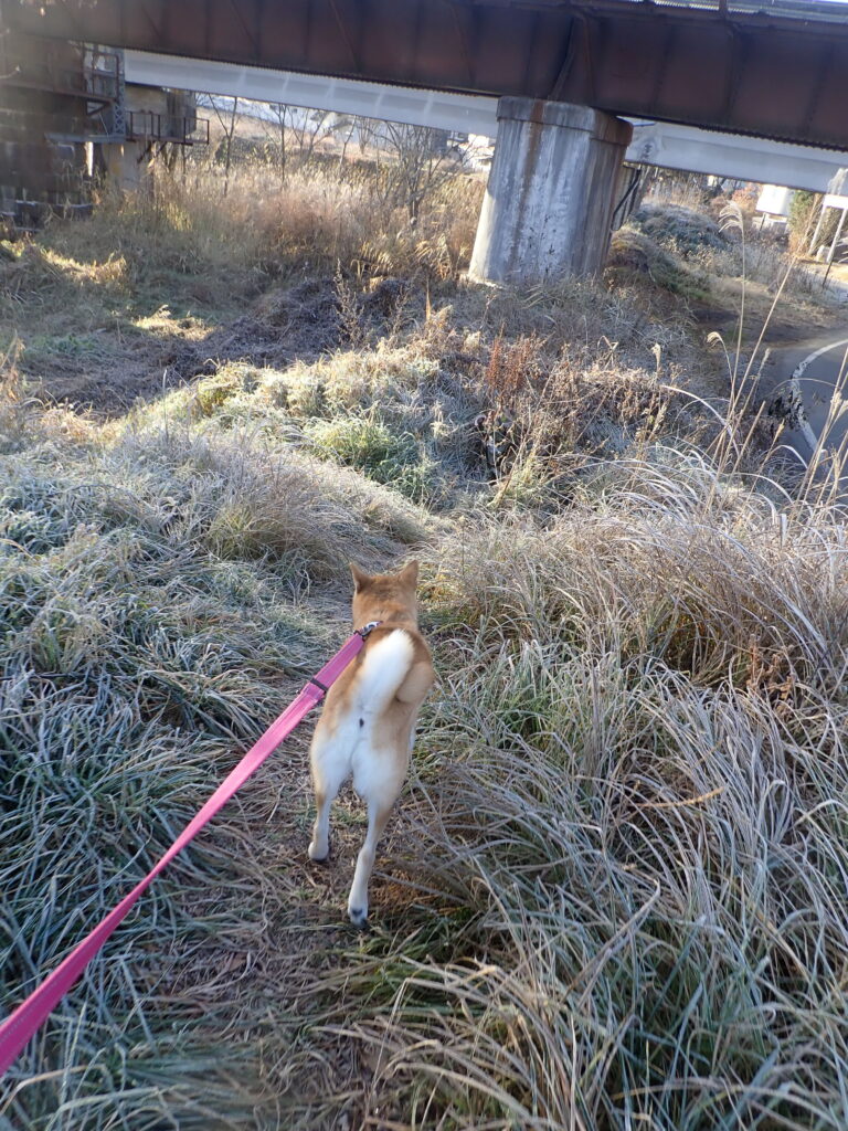 今朝は冷え込んで、最低気温氷点下4℃。土手は霜で真っ白。